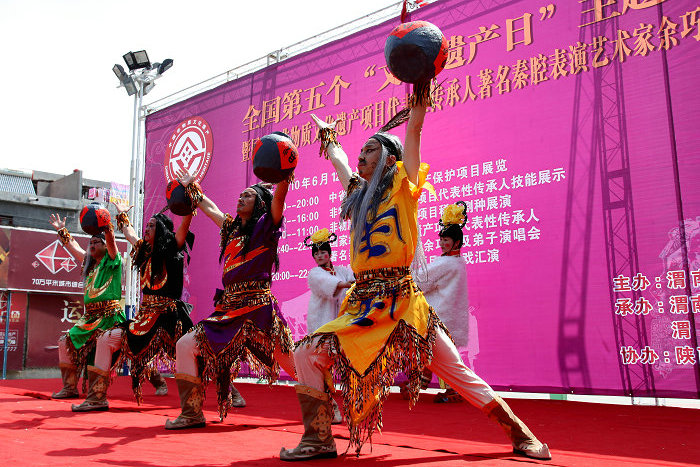 合阳跳戏,独存于合阳县沿黄河一带村庄,以新池镇行家庄最为有名。跳戏又称“调(tiao)调”或杂戏,它是伴随着狩猎、赛神、跳巫等民俗活动发展而成的。跳戏以锣鼓作为主伴奏乐器,以吟咏与民间舞蹈结合,来展示故事情节。跳戏分为哑跳和台跳两种形式,主要动作为“上势”。跳戏表演古朴、粗犷,剧目丰富,脸谱独特,曲牌别致,表演风格因衍生环境、民俗风情和传承人技艺的差异形成了不同流派。2005年文化部有关专家对合阳跳戏进行了考察,认为这一古老剧种对于研究我国戏曲史、舞蹈史及民间风俗有着很高的学术价值,誉为中国戏剧的“活化石”。合阳跳戏2008年被列入第二批国家级非物质文化遗产名录。