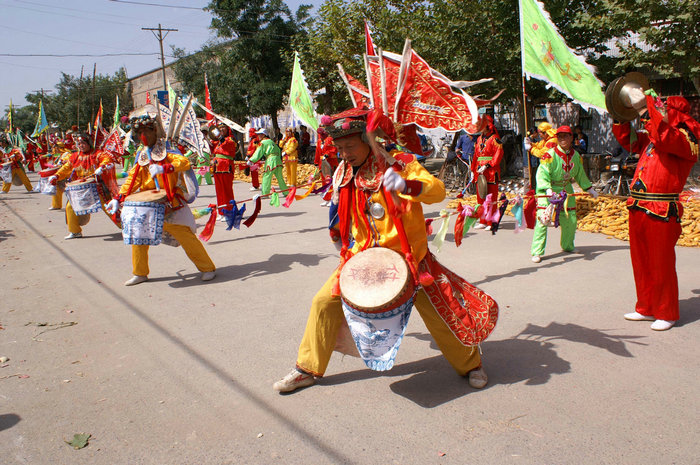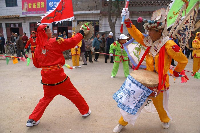 相传,洪拳鼓是源于古代一种士兵操练的鼓舞形式,流传于澄城县刘家洼乡,因击鼓动作融会了小洪拳的架式而得名。鼓点以七槌子为主,故又称“七槌鼓”。洪拳鼓的表演队列,由一个鼓手、一个铙手、两个敲大钹和一个绕杆子者五人组成一组,一般少则八组,多时可达十二组,同在两个舞红棍者指挥下表演。鼓舞者身穿传统戏曲中的校尉服饰,头扎英雄巾,戴披肩,背靠旗,扮成古代武将模样,显得威风凛凛。全舞包括三个部分,即“摆道鼓”(行进表演)、“七槌鼓”(场地表演)和“落场鼓”。“七槌鼓”是核心舞段。因为这种鼓舞是用于祭祀活动,因此队形变换严谨,气氛庄严肃穆,不像一般民间鼓舞所表现的那样热烈欢快。在表演过程中,由绕杆起式,鼓、铙、锣手随着绕杆的起落按照七槌、十一槌鼓点而变换队形,鼓手们在单跳、对打、交叉与浑厚铿锵的鼓、铙、锣声中进行表演,舞蹈动作古朴、粗犷、雄健。洪拳鼓2007年被列入第一批陕西省非物质文化遗产名录。