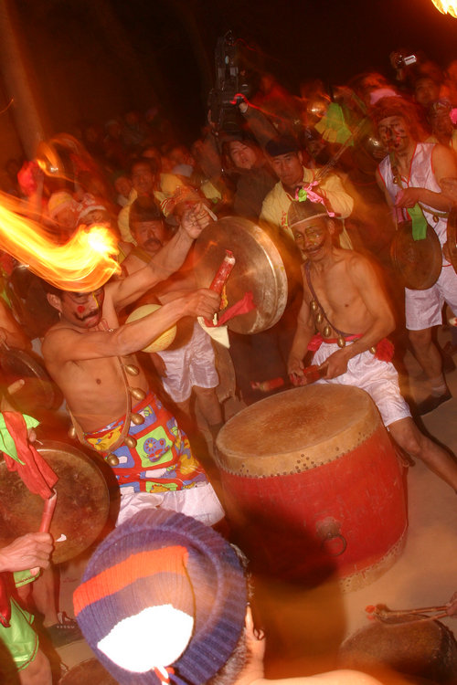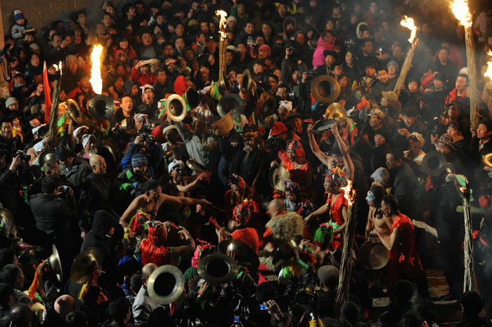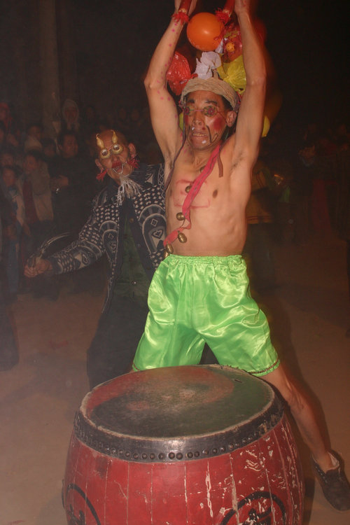 为祈福求神,合阳县坊镇东北角黄河崖畔东雷村每年正月在村里三官庙前闹社火。上锣鼓是该村社火最具特色的组成部分。以“狂、蛮、怪、狠”闻名,极具粗犷古朴的美感。
