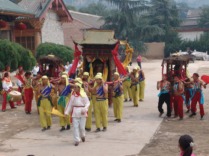 东庄神楼是韩城市西庄镇东庄村等地村民祭祀法王、求雨祈福的一项民俗活动,又叫“耍神楼”、“耍爷架”等。神楼是祭祀活动中用于抬神像的轿子,东庄神楼所抬神灵是西庄镇法王庙中供奉的法王,法王姓房名寅,是韩城历史上的名医,传说因为给宋真宗梦中治痈而被封为法王。西庄镇附近的八个村庄(八社)轮流供奉法王神楼,每年正月十五迎神于村,清明节送神还庙。迎送神楼时,火铳开道,村牌对联在前,道锣大号在后,锣鼓声中,赤面金身、横眉怒目、手持宝剑、脚踩毒蛇的法王神像端坐在神楼被众人簇拥着赫然出现。神楼周围吊有千百铜环,抬楼人手足戴有串串铜铃,抬手以统一的步履轻踏慢进,作和谐律动,铜铃、铜环铿锵作响,与锣鼓声相呼应。一旦锣鼓队敲起震天动地的祭祀锣鼓,神楼左摇右摆,铜环声扣人心弦,呐喊声震谷裂川。法王神楼前还有两个抬着“黑虎”“灵官”的小神楼,俗称“武神楼”,于东庄神楼舞动时前闯后拥,东庄神楼活动高潮时场面宏大,被誉为“社火之王”。东庄神楼2007年被列入第一批陕西省非物质文化遗产名录。