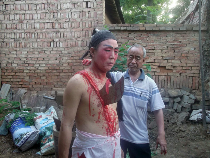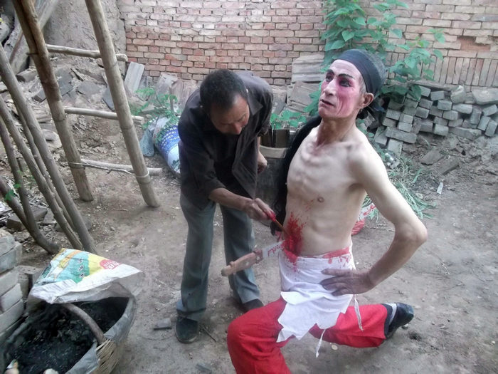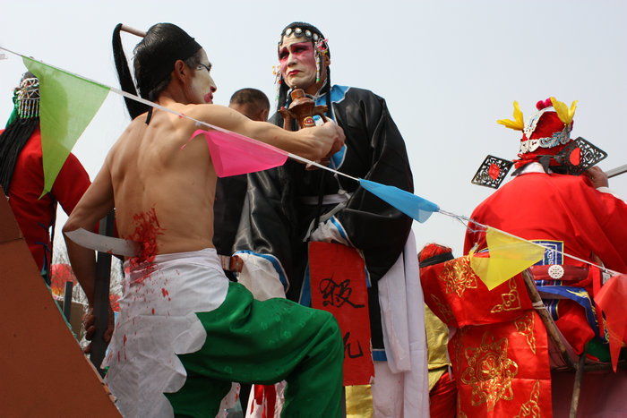 蒲城血故事流行于苏坊镇姚古村,是民间艺人在大车上表演杀戮场面的造型艺术。它是该村雷姓家族的不传之秘,北宋时期从山东迁来,距今已有1000多年历史。每逢正月十五、正月二十三和二月二,姚古村都要举办血故事表演,为族人驱除邪祟,整肃族风。表演前,先祭神祖,由会长聚族人于庙前(庙中供奉牛王、马王和药王),焚香叩拜,求六畜平安。再由社火会会长率众到村外先人坟茔进行春祭,然后鸣锣鼓,列仪仗,开始绕村一周的血故事表演。表演时分为静态造型和动态造型两大类:静态造型,即造型后,在车上或马上静止不动,有的肠子外露,有的尖刀穿身,有的刀劈脖颈;动态造型,即提前巧设机关,在车上或马上,经过几个回合的武打后,形成刀插头顶、解锯分身、抽肠换肚、换掉头颅等造型。蒲城血故事造型细腻逼真,惊险刺激,以“惊、奇、险”著称,“血”,有镇妖、祛邪之意。这一民俗,传递并寄托了人们除暴安良,扶正祛邪的朴素理想。蒲城血故事特技2007年被列入第一批陕西省非物质文化遗产名录。