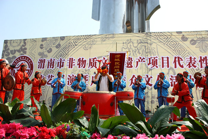 澄城鼓吹乐主要分布和流传于澄城县县城、茨沟南北及周边地区。从乐器的配备和乐曲的种类上看,澄城鼓吹乐可以分为唢呐曲牌和大型套曲两种。沟北以演奏唢呐曲牌为主,风格粗犷豪放,乐器简单,有唢呐、小鼓、鼓板、小钹等,乐队成员4-6人;沟南和县城擅长演奏鼓吹乐套曲,风格委婉细腻,乐器配置齐全,有笛、管、笙、锣、鼓、梆子、铙钹、马锣、小锣、小钹、勾锣等,乐队成员8-10人。澄城鼓吹乐的曲牌来源于地方戏曲曲牌、传统曲目和民歌,以戏曲曲牌为多。大型套曲有《五子登科》、《梵王宫》、《青天宫转老仙堂》、《柳生芽带一串铃》等。民间鼓吹乐以口传身授和手抄曲谱传世,近年来搜集整理出曲牌66首、套曲16首。艺人们善于根据演奏的场合及礼仪活动现场气氛,灵活掌握演奏速度,有时以变换速度来表达不同情绪。澄城鼓吹乐演奏方式独特,演奏时伴以舞蹈或小杂耍,深受群众喜爱。澄城鼓吹乐艺术2009年被列入第二批陕西省非物质文化遗产名录。