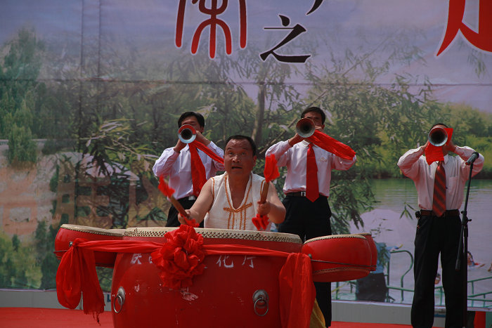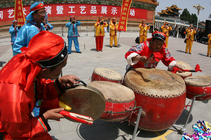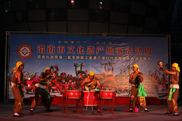 五圆鼓分布在合阳县境内及周边地区,以合阳县路井镇北党村最为驰名。因打鼓时由中间一大鼓(直径约两尺)、周围四个小鼓组成,故称“五圆鼓”,寓意圆满。表演时小鼓紧靠大鼓组成梅花状。敲击者站在小鼓的正面,面向观众,两侧有唢呐手两个(有时四个、六个不等)。前侧各有大钹、小钹、大锣等配器。五圆鼓的敲击分三个部分:第一部分为“引子”,以打击乐为主,制造气氛,酝酿情绪;第二部分为“双凤朝阳”,以一人吹“双唢呐”为主,一般双唢呐在吹奏时口里还夹着哨子(即唢呐发声体),主要是为打五圆鼓“上板”;第三部分为“打五圆”,即鼓手两侧的唢呐吹奏节奏极强的“五圆调”,鼓手按照小钹、大锣和唢呐的节奏,依次敲击每个鼓。鼓手主要特技有缠项、单扫边、双扫边、对角线击、抛槌、转背击等,其槌法轻重有致,呈现出起伏跌宕的音乐效果。五圆鼓被广泛用于民间各种仪式演出,在做寿诞时敲打,被称为“五枝梅花”;娶亲时敲打,被称为“五子登科”等。五圆鼓2009年被列入第二批陕西省非物质文化遗产名录