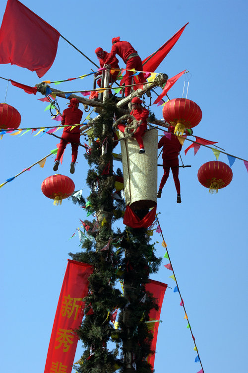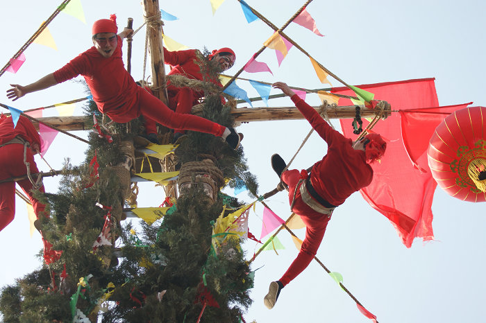 澄城县雷家洼乡堡城村“上刀山”特技始创于民国初年,由该村焦刘宝、焦彩茂二位老人根据民间杂技“扶老杆”改进而成。“刀山”以捆扎几节木棍为帮、以若干铡刀为格、搭成20多米的高杆梯。表演时六名勇士“上刀山”,即在刀与刀的空档跃身而过,随即登杆表演。其主要特征:一是构架悬。以砂瓢做底座,承受两吨之重,上有双十字木椽,架于高空,无风也有一米左右的摆幅。二是表演险而富有美感。双杆高竖,红旗翻飞,铃声传响,刀光映日,表演者身缠柏枝,于刀丛中各显身手。表演溜梢棍、倒挂脚面、侧身摘星、蝎子编尾等绝技绝艺,使观者心惊目眩。澄城表演特技“上刀山”2009年被列入第二批陕西省非物质文化遗产名录。