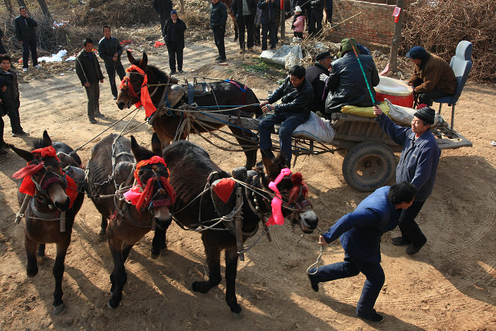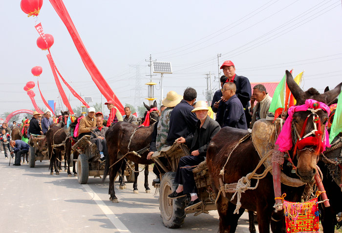 跑骡车是民间社火的一种表现形式,已有上千年历史,主要流传于临渭区的孝义、吝店、南师、故市、官道、下吉、田市等乡镇,其中以故市一带的表演最为驰名。一挂骡车一般由四骡十人组成。骡分辕骡、首套、中套、外稍,每辆车都有4个吆车的(1个吆骡子的,1个坐辕的,2个马童),另有6个敲锣鼓的,他们身着鲜艳的对襟民族服装,其中1人以击马锣作指挥,另有1人敲鼓,4人敲饶“跑骡车”均为多车连挂,成双成对,取祥和吉利之义。表演开始,吆骡车人鞭子吧嗒一甩,骡子奋蹄在在大道上狂奔,此时,锣鼓声、马嘶声、铜铃声和成千上万观众的呼声喝彩声响成一片,如急风暴雨、山呼海啸。到达目的地,骡车会泊在一片平坦的场地上表演璞鸽踅窝等绝活,由动转静,静中有动,锣鼓表演整齐而威武,场面十分壮观。跑骡车2009年被列入第二批陕西省非物质文化遗产名录。