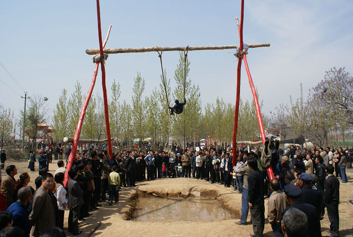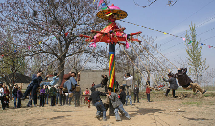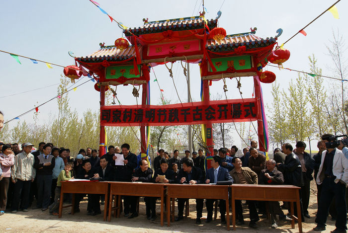 华阴司家村清明节“秋千古会”约创始于清咸丰年间,至今有200多年历史。该村古称“南孟屯”,旧时是扼守军事要冲——“潼关”的驻军之地。据传清末有一胡姓军官,为了士兵强身健体,活跃军事生活,常以荡秋千为乐,后世道太平,军人就地转民,这一习俗亦传承下来。