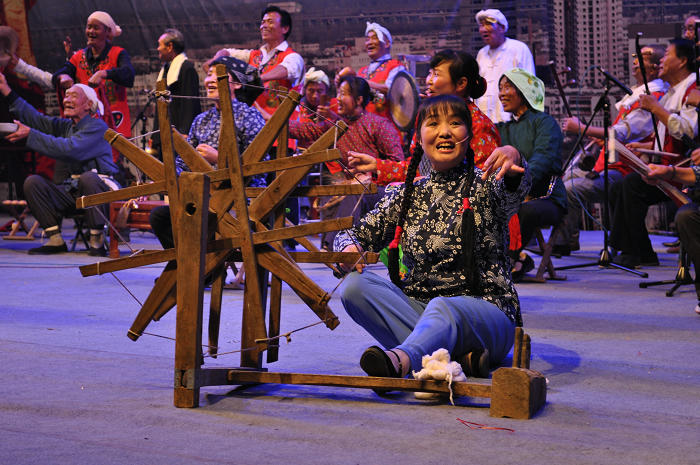 朱王秧歌剧主要分布于临渭区及周边地带,以双王办朱王村最为有名,它形成于明末清初,大约在清代末年汲取了一些传统戏剧的元素,表演场地从田间地头搬到农家小院。朱王秧歌剧汇锣鼓、民歌、舞蹈、杂戏等多种表演形式于一台,内容涉及农村爱情、神话传说、乡土趣闻等多个方面,有《偷荷包》《双放牛》《孝儿上坟》《卖杂货》《农家乐》等100多个经久不衰的传统剧目,能连唱几天几夜而不重复,朱王秧歌剧现存曲调60余种,分为开门调、平音调、半开门调,花音调等,句尾多衬虚词,用以加重语气、表达情感。表演时,人数不限,但基本都用纺线车、烟袋锅子、小木墩、竹蜻蜓、白羊肚头巾、大老碗、花布衫等农家小院现成的生活器具来表现“男耕、女织,白发垂髻并怡然自乐”的场景,本色自然,亲切生动。朱王秧歌剧2011年被列入第三批陕西省非物质文化遗产名录。