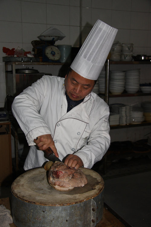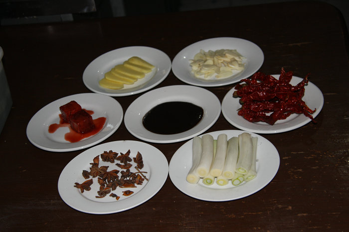 带把肘子相传是明代弘治年间同州(今大荔)厨师李玉山所创,距今已有600余年历史。因其选用整只带骨猪肘制作,成菜后猪骨酷似把柄,故名带把肘子。其基本制作工艺是:将带脚爪的猪前肘刮洗干净,肘头朝外,肘爪朝里,肘皮朝下放在砧板上,用刀在正中由肘头向肘把沿着腿骨将皮剥开,剔去脚骨两边的肉(三面离肉),底部骨与肉相连,使骨头露出,然后将两节腿骨由中间砸断,入汤锅煮至七成熟,沥干水分,趁热用红酱油涂抹肉皮。于蒸盆底放调料(秘不外传),将猪肘肘皮朝下装入蒸盆,整成图形,撒入精盐,用消过毒的净纱布盖在肉上,再将甜面酱、红豆腐乳、白酱油、葱姜蒜等在纱布上抹开,上笼蒸熟蒸烂取出扣入盘中,上桌食用时配以葱段和甜面酱。带把肘子成品颜色枣红,肘子带骨带蹄,成菜如丘,吃起来肥而不腻,瘦而不柴,肘皮胶粘,香味醇美,是一道富含蛋白质、钙质的菜肴。大荔带把肘子制作技艺2011年被列入第三批陕西省非物质文化遗产名录。