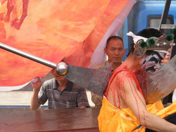 华山红社火又名血故事、血虎子,据说是元末明初时王姓家族迁徙于华阴,在当地祀神祭山活动中得到启发而开创的社火形式,至今有近800年历史,经世代传承,久演不衰。