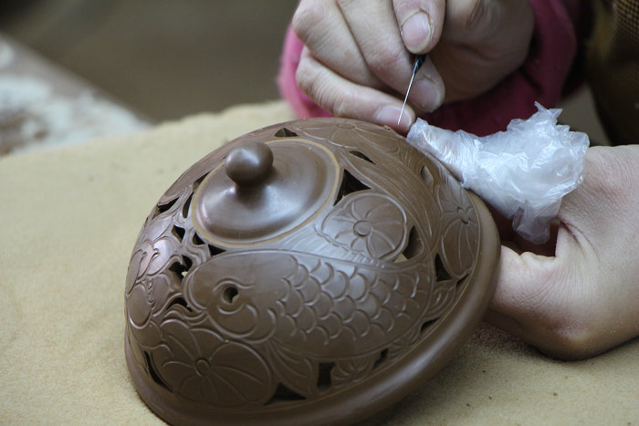 秦源影雕黑陶主要分布于临渭区及周边乡村,这里特种红黏土和绿胶泥储量丰富,适合黑陶制作。影雕黑陶经过选土、淋泥、揉泥、制坯、压花、镂空、阴干、烧制、清洗、包装等二十多道工序制作而成,工艺独特,特征鲜明:一是颜色黑亮,不借助任何材质的釉料,全凭陶土高温烧制过程中渗碳窑变而成;二是质地坚硬,陶土熟化程度好,烧好的成品即使薄如蛋壳,也硬度很高,敲击时发声清脆;三是造型丰富,有尖底瓶、罐、盆、熏炉、陶埙等多种造型,附带的提钮、把手、高足等形态各异;四是图案古朴,通过镂空、刻画等手法将鱼龙变化、百鸟朝凤等远古时期的图腾转化为富有韵律的抽象线条,赋予了黑陶浓厚的艺术魅力。使其深受国内外艺术家、游人喜爱。秦源影雕黑陶2013年被列入第四批陕西省非物质文化遗产名录。
