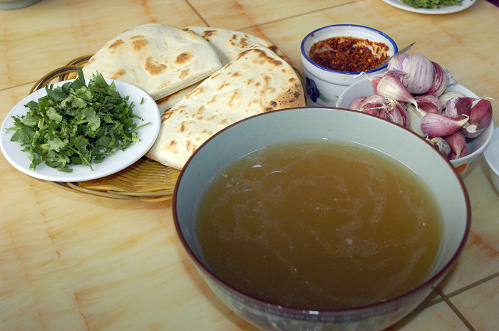 蒲城水盆羊肉是一种古老的饮食制作技艺,其中的清汤羊肉即秦汉典籍中常见的“羊羹”,月牙烧饼即东汉时期出现的“胡饼”。当地民间也有“先有秦家店,后有蒲城县”的说法,说明蒲城水盆羊肉至少已有1800多年历史。蒲城水盆羊肉制作颇具古风:将宰杀好的肥羊带骨斩成大块,放进水缸里浸泡,拔出肉中余血,使肉质松嫩。烹制羊羹时选用能容纳三五只羊的大锅,将大块生肉投入,加水淹过羊肉,放入调料包(秘方配置),文火烧煮六个小时后捞出,拆骨撕肉,撇净锅内浮油,原汤小火继续熬制,待浇汤食用。水盆羊肉吃法独特,将羊肉用手撕成细片状,入碗、浇入羹汤,配以月牙烧饼。另有生蒜、香菜、辣椒供食客选择。正宗蒲城水盆羊肉,肉嫩烂而鲜,汤浓郁而淳,具有药膳滋补之功效。蒲城水盆羊肉制作技艺2013年被列入第四批陕西省非物质文化遗产名录。