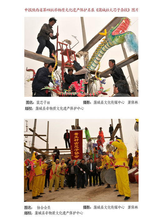 蒲城芯子分布于蒲城县境内,以焦庄村、晋王村等地最具代表。据传,唐朝士兵为庆祝胜利,把用于攻城瞭望的长梯背到肩上,让战友在梯子上纵情表演,这就是“背芯子”的由来。蒲城芯子旧时多在农历二月二演出,后来由于庙宇倒塌和为照顾农事活动改为正月十三至十五,三天为期,活动主题都有精巧的安排。第一天为时政国事;第二天是东中西三社之间互相叫阵,如东社演《打焦赞》(因西社人以焦姓为主),西社则打《战吕布》(东社以吕姓居多),中社扮演协调角色;第三天则以团结为主题,三社同出《桃园三结义》等剧目,握手言和。芯子演出少则三五台,多则二十余台,根据传统戏剧的妆扮分为下(根子)、中(二截筒)、上(梢子)三层或四层。蒲城芯子节节有题牌,两边配三眼铳、神棍护卫开道,队伍长达数百上千米,十分壮观。蒲城芯子2013年被列入第四批陕西省非物质文化遗产名录。
