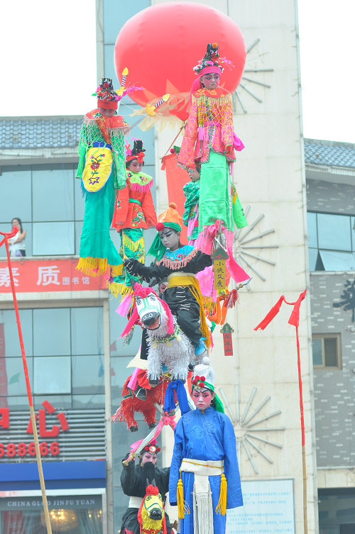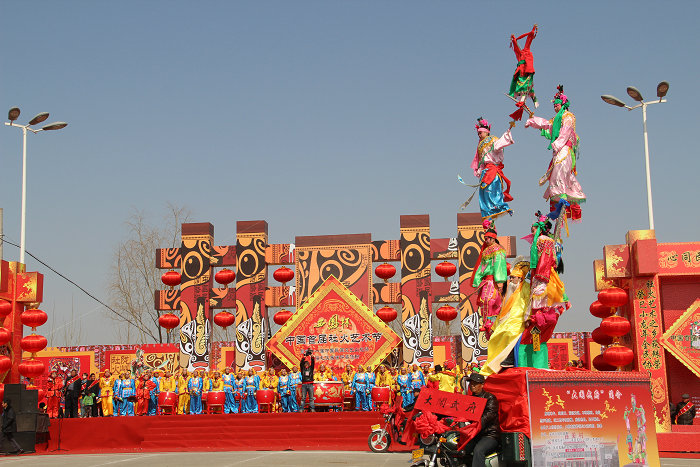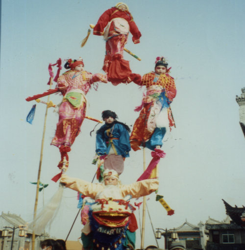 华阴天芯子又名赛飞天,是流传于华阴市西关村等地的一种民间社火表演。据老艺人称,明末清初天芯子就已流行,民国时期达到鼎盛。天芯子一般多为三到四层,高度可达10米以上,取式玄险,结构有动态有静态,分支造型多达三四杆,每台的扮演人数十多个,有的高挑、有的倒悬、有的横出,给人以岌岌可危的感觉。天芯子多在正月十五到二月二之间表演。演出时,马队在前清道;书写对联的门牌紧随;接着一个扛老杆(长约三丈,杆上饰有各色彩带)的人;随后是四组童子军,每组锣、鼓、铙各一面,称为对子鼓;接对子鼓的是身着彩衣的仪仗队;接下来是社火主体故事队,一般8-10桌,每桌由八人抬着前进;最后是爆爆腾,也叫后坠,四个丑角与围观者逗乐嬉戏,增加喜庆气氛。整个社火队伍长达一华里有余,阵容宏大。为了筹资办社火,当地还有许多的有趣习俗:村民不得拒绝社火期间摊派的事务;村中女子出嫁,社火头会在城门挡轿,要求男方为村里添置演出服装和道具;出社火前,有人拿装着麦草的筒子笼在巷道转悠,意思是“收软蛋”,激发人们的参与意识。华阴天芯子2015年被列入第五批陕西省非物质文化遗产名录。