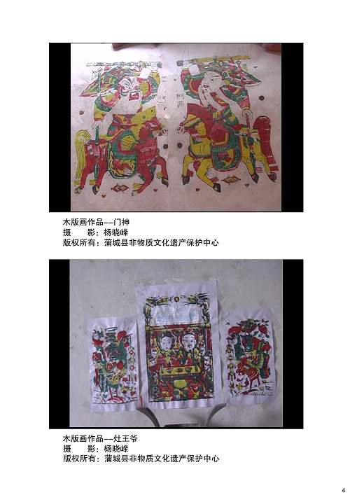 蒲城县西的兴镇,古称“旌仕坊”。 旌仕坊木版画技艺源远流长。据专家考证,唐朝时已形成规模。五座唐陵在蒲城修建的百余年间,祭祀活动频繁多样,炮火包装、冥钱印制装潢等需求旺盛。从而繁荣了兴镇的造纸和印刷业,明清科举制度下,蒲城学子争相考取功名,也刺激了造纸业和印刷业的发展。旌仕坊木版画是一种古老的雕刻印刷技艺,现存的古雕版画有三大系列(宗教民俗、商业应用、文化图书)十四个类别(佛像、门神、灶神、财神、天神、地神、钟馗、历书、插图、商品标签等)。雕版一般选用杜梨木、红木、黄花梨木等名贵硬木,由近百种刀具交换使用刻、切、锉、剔、琢等雕刻手法刻制而成。旌仕坊木版画的颜料有黑、红、黄、绿、蓝五色,全部使用纯天然植物和矿物质自己配制,具有年久色如新、遇水不褪色的特质。印制采用二色以上套印,其配色及印制技巧秘不示人,只在师徒间口耳相传。蒲城旌仕坊木版画技艺2008年被列入第一批渭南市非物质文化遗产名录。