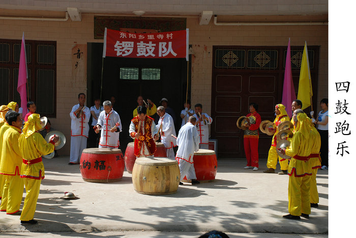 东阳跑乐是华县东阳乡的一种锣鼓演奏艺术。作为鼓乐表演,其特色在“跑”,即演奏者围着鼓不停地四面转动。东阳跑乐表演时,用3-5面大鼓和20副左右的铙钹马锣。鼓手手持双槌,两臂交挥,双腿扭动,各击其鼓;逆时针转三圈后,闪电般地从一个鼓跑至另一个鼓,组合成变幻莫测的阵营转化场景,令人眼花缭乱。鼓阵旁边十几名铙钹手、锣手排成两列,身穿黄马褂,配合着鼓点击打出铿锵的节奏。跑乐的乐章一般分为八段:第一段为“乐头”(或乐帽);第二、三、四阶段由马锣起奏,大鼓、铙钹跟随,徐疾相间,从容不迫;第五阶段是高潮部分,节奏衔接紧密,富有变化;第六、七、八阶段渐渐趋于平缓,直至收尾定声。跑乐的乐谱十分丰富,经常演奏的有《下河东》、《下西川》、《凤凰单闪翅》、《八虎闯幽州》、《风搅雪》、《拜将》等50多种,容纳了丰富的传统音乐内涵。东阳跑乐2010年被列入第二批渭南市非物质文化遗产名录。