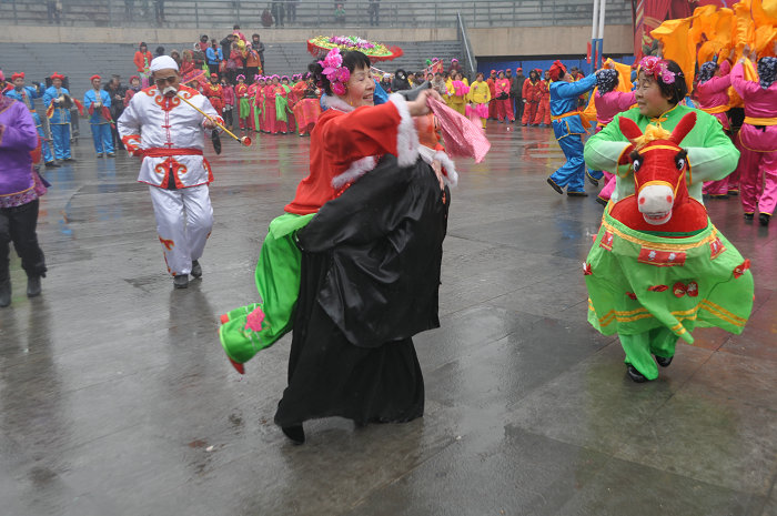 跑汗马是流传于临渭区的民间社火表演艺术,一般在逢年过节时演出。“汗马”由铁丝、彩纸、纱布、竹子等糊贴定制而成。汗马队一般由5-10人组成,马夫居前,汗马队居中,马婆子殿后。马夫头裹花毛巾,腰系彩绸腰带,手持马鞭,嘴噙口哨,是马队的引路人。汗马队由马夫的哨音统一步调,变化套路,要求步伐统一,轻便灵活。马婆子是男扮女装的丑角,戴大鲜花,垂大耳环,忸怩作态,摇芭蕉扇,令人捧腹。跑汗马通常和舞狮、秧歌配合表演,组成声势浩大的社火队伍,场面十分壮观。渭南跑汗马2010年被列入第二批渭南市非物质文化遗产名录。