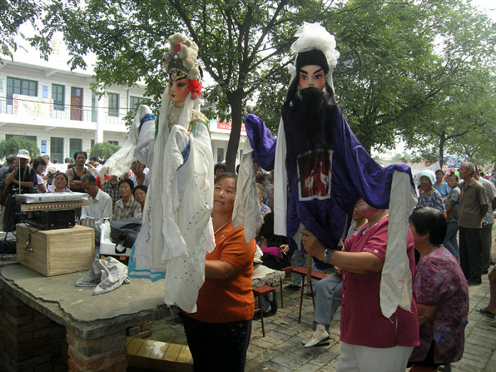 大荔木偶戏,乡间也叫“肘娃娃”,已有400多年历史,是用撑杆木偶代替真人表演、并由艺人同步演唱的演出形式。唱腔和剧目一般直接从秦腔导入。主要分布于大荔县苏村乡。大荔肘木偶的基本内容:一是用桐木雕刻化妆戏剧人物脸谱做偶头,用硬纸裱糊胸腔。由身子、两臂组成人物框架,穿戴上戏剧服装,成为一个个戏曲人物偶像。木偶能完成眨眼、张嘴、摇头、转身、拿物等动作。二是它在舞台演出时,配合灯火、布景、音乐、演唱成为一种人演大戏的浓缩体进行戏曲表演。三是如果有特殊效果设施,可达到人唱大戏而不能及的艺术效果,如腾空、驾云、隐身等,变化莫测。大荔木偶戏生旦净末丑行当齐全,演出的本戏有《宝莲灯》、《双罗衫》、《牧羊卷》、《大报仇》、《配凡》、《黑叮本》等,折子戏有20多个。肘木偶集戏曲艺术和操作技艺于一体,为关中群众喜闻乐见。大荔肘木偶2010年被列入第二批渭南市非物质文化遗产名录。