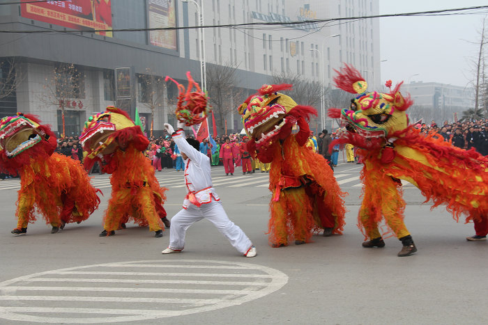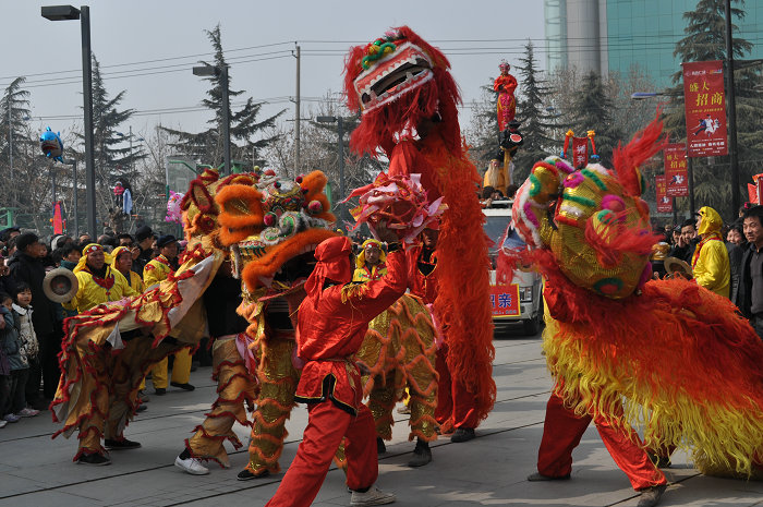 大同舞狮是临渭区官路镇大同村同姓家族历经十三代传承至今的社火绝技。以文狮表演为主,除上天梯等个别表演环节外,整体上造型朴实,动作舒缓。表演时,在焰火的烘托和锣鼓鞭炮的喧闹声中,活灵活现的狮子摇头摆尾,迈着灵动的步伐,闪亮登场。整只狮子由两人分饰狮头狮尾,伴随驯狮者手中的绣球,可以完成打滚、舔毛、伸腰、直立、挠痒、吐灯、过人等30多种技巧动作,展现出狮子的活泼可爱和平易近人。渭南舞狮2010年被列入第二批渭南市非物质文化遗产名录。
