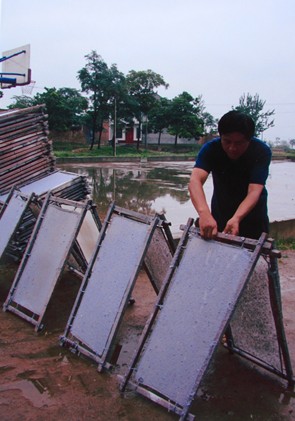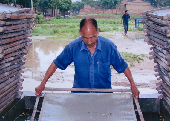 据传,造纸术发明人蔡伦曾在渭北民间一带造纸,其弟子将捞纸技艺传给了老庙镇河绕村的百姓。《富平县志》记载,旧时的捞纸作坊以制造火纸、烧纸、仿纸为主。老庙捞纸以烂鞋、绳头、麻头、旧书等为原料,采用纯手工技艺制作而成,号称七十二道工序,主要由以下八部分组成:一、割货,用斧子把原料剁成小块。二、打炉。把原料切碎煮熟,去除胶质,分散纤维。三、碾货。熟料加水压碎。四、淘瓤子。按比例配置原料,搅拌均匀。五、捞纸。运用舀、摆、荡等手法,使纤维均匀地附着在纸网上。六、压坡子。挤压掉多余水分。七、晒纸。把纸网放在户外晒干。八、整纸。把纸揭下来,进行整理裁剪,包扎成捆。老庙捞纸颜色显黄、灰色,主要用于祭祀焚烧、裱糊字画、练习书法等,其特点是“永不褪色变形”。富平老庙捞纸以活态传承的形式保存着《天工开物》等古代科技著作中的造纸技艺,体现了中国传统文化中的循环经济思想,具有重要保护价值。富平老庙捞纸技艺2010年被列入第二批渭南市非物质文化遗产名录。