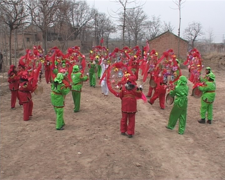 背花锣是流传于潼关县三堡村一带的一种社火舞蹈,相传产生于明嘉靖年间。背花锣的特色道具“背花”由竹子扎制而成:用长竹条扎成U型框架,框架的拐弯处近似直角,垂直底边固定两根竹条,平行底边固定三根竹条,用布带将竹条绕紧包好,结合处绑上绢花,布置三面镜子,顶部固定一条长长的红绸飘带即可。背花锣以队列行进式表演为主,队伍最前面是一位手持醒目指挥棒的总指挥,紧随其后是四列八行彩旗仪仗队。仪仗队后面是中鼓、铙钹、大锣各四副,拱卫着一面大鼓,组成背花锣的乐器指挥中心。背花锣舞蹈队殿后,人数一般为40-60人,表演者身穿红、绿彩绸服饰,腰绑背花,手持小铜锣,一边敲锣一边舞蹈,动作粗犷、进退自如,具有独特的艺术美感。背花锣长期以来是当地欢庆丰收、节日庆典、庙会祭祀时的重要表演节目之一。潼关背花锣2013年被列入第三批渭南市非物质文化遗产名录。