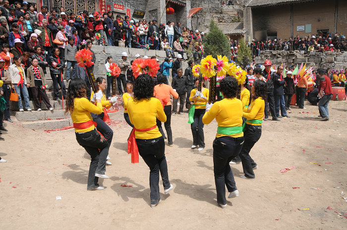八仙板舞蹈又叫“打八仙”,是蒲城县尧山一带清明祭祀尧山圣母的一种传统舞蹈表演形式,相传创始于明天启后期。其特色道具是八仙板和背花。八仙板类似常见的快板,为发声响亮,中间各加一片薄桑木片。背花是用拇指粗细的竹竿做成支架,扎成神龛样式,神龛内有简笔画的八仙形象,外表用彩色纸裱糊装饰,顶部用纸质彩旗做成“神楼”。一个背花饰演八仙中的一个角色。八仙板的舞蹈队列一般由十七人组成。其中一人妆扮成丑角,胸前挎小圆鼓,以口哨指挥队伍的行、止、队形变化及节奏快慢。其他人分为两组:一组各穿八仙服装、画八仙戏剧脸谱、肩上斜跨八仙法器、身背该仙的小背花神楼,站在中间;另一组穿统一服装,身背大背花神楼,四人执镲,四人持锣,分列八仙两侧。八仙板和别的一些传统舞蹈形式类似,也分为行进式和场地式两种。表演时队列严谨、舞者表情肃穆、动作挥洒自如,保留了祭神、娱神的传统仪程,具有鲜明地域特征。蒲城八仙板2013年被列入第三批渭南市非物质文化遗产名录。