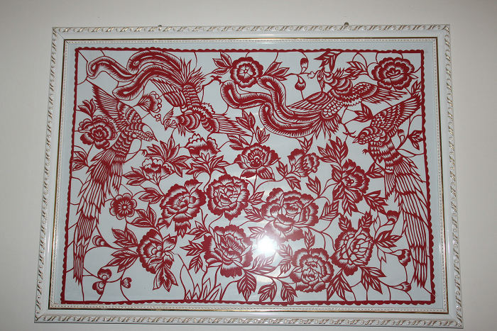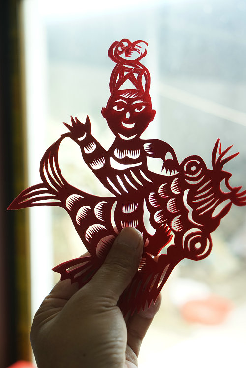 白水剪纸以尧禾镇为典型。诗人杜甫旅居彭衙(今白水)时曾写下“暖汤濯我足,剪纸招我魂”的诗句,这是关于白水剪纸的最早记载。白水剪纸或张贴于门窗、墙壁、灯笼、彩扎上作为装饰;或用于点缀礼品、嫁妆、祭品、供品等实物;或用作鞋帽、枕头、衣裙等生活用品的刺绣底样;或作为印染的底版,在衣服、被面、门帘、围兜、包袱皮等上面印花、印字;或用作剪纸传承的范本、纸样。白水剪纸剪时先在白纸上画好图案,把它订到叠好的彩色纸上,然后修剪成型,过程看似简单,却往往蕴含了一个艺人几十年的扎实功底。白水剪纸大多取材民间实景,喂猪、放牛、鸡鸣狗吠和男耕女织都是最常见的题材;也传承了许多洗练抽象的民俗符号,如蟾蜍、蜘蛛、牡丹、枫叶、龙型纹等;艺人也经常根据时代新风貌进行创作,如《三农快客》反映了“村村通”之后农村的新变化。剪纸的刀工细腻、逼真、朴素自然,耐人寻味。白水剪纸2013年被列入第三批渭南市非物质文化遗产名录。