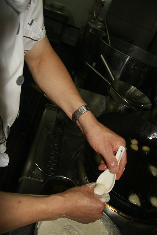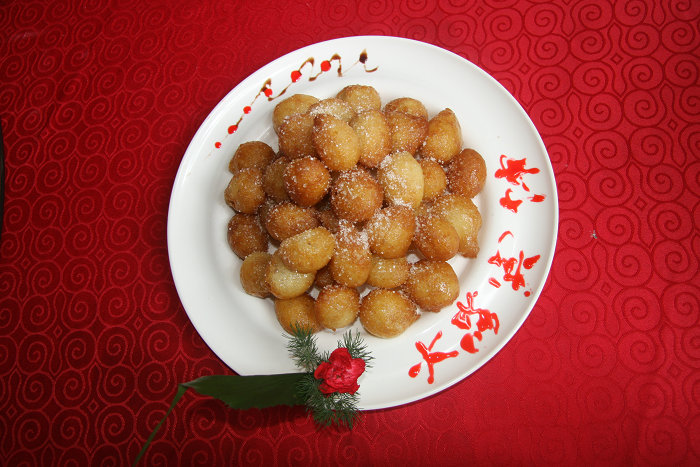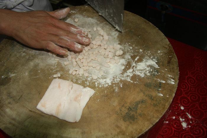 蜜汁轱辘是大荔县流行的一种甜食点心,据传始创于清朝,距今有300多年历史。主要以面粉、大油、植物油、蜂蜜、白糖等原料制作而成,味美可口,深受当地群众的青睐。其制作工艺有:1、备料。取适量面粉、大油块备用。2、搅面。先倒少量开水烫面,再用凉水和开,大油块切丁掺干面粉,倒入面糊里搅拌均匀。3、炸轱辘。在铁锅里倒植物油,烧热后把面糊用手挤成圆形小面团,放入油锅里,炸成金黄色出锅。4、飞蜂蜜。另备一个铁锅,锅里放少许油,把蜂蜜化开,将炸好的轱辘倒入锅内和蜂蜜搅拌。5、装盘上席。将轱辘装盘里,均匀撒上白糖,趁热即食。蜜汁轱辘小巧玲珑、风味独特,其基本特征在当地素有:“外形圆球如算珠,色泽金黄很突出,外脆里软吃着香,蜜甜可口味道长......”的说法。蜜汁轱辘制作技艺2013年被列入第三批渭南市非物质文化遗产名录。