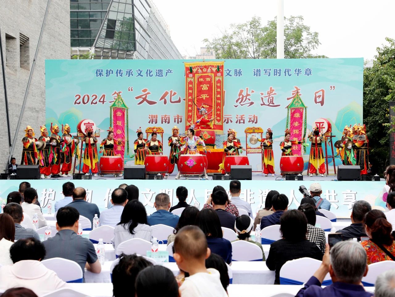 在渭南市文化艺术中心广场上,富平老鼓以气贯长虹之气势,伴着飒爽优美的舞姿,刚柔并济、美妙绝伦,吸引了众多的观众,也拉开了2024年“文化和自然遗产日”渭南市宣传展示活动的序幕。今年活动内容丰富多彩,有“非遗保护一法一条例”宣传、非遗项目展演、非遗大集(非遗购物、非遗美食体验)、非遗主题摄影展、非遗展示传习馆免费观影等活动。