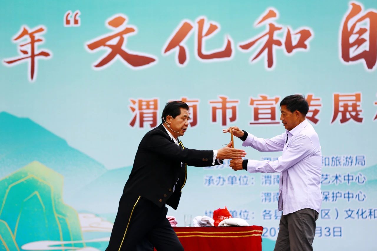 非遗项目展演精彩荟萃,观众掌声雷动。合阳提线木偶戏表演技艺精湛,提线人赋予木偶以艺术生命,《钟馗醉酒》栩栩如生,观众看得出神着迷,无不引颈探腰;黄河老腔《黄河谣》磅礴豪迈,吼出了黄河儿女的情怀,吼出了酣畅与魅力;华山戏法《无中生有》表演者和观众近景互动,引得现场观众惊叹叫绝;华阴迷胡《屠夫状元》、华州秧歌剧《卖杂货》、传统舞蹈《二鬼打架》、朱王秧歌《农家乐》让人回味无穷……精彩纷呈的非遗戏剧表演,展现了渭南深厚的传统文化的魅力。