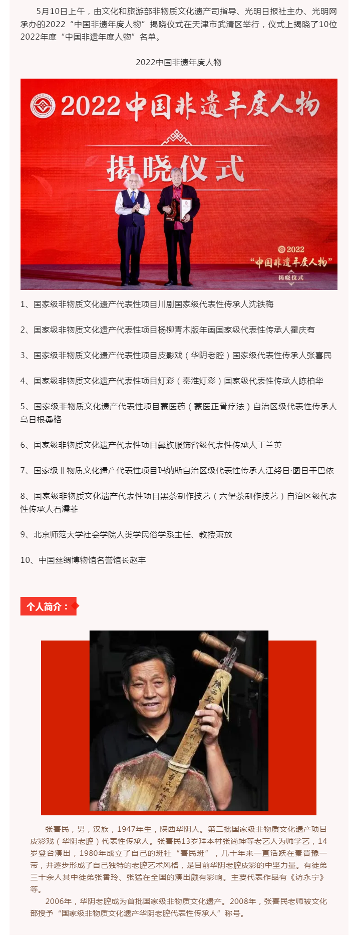 喜报!华阴老腔国家级代表性传承人张喜民荣获“中国非遗年度人物”