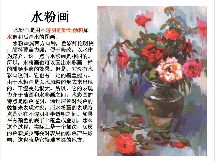 水粉画是用不透明的粉制颜料加水调和后画出的图画。